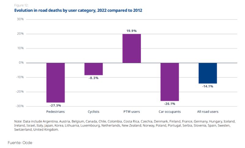 Sorprende ver que entre todos los países lo que afecta la estadística son las motos, y que ese tema sea especialmente grave en Colombia.  Allí está la principal clave de la inseguridad vial. Mientras muertes de peatones caen 27.3 %, ocupantes de vehículos 26.1 % y de ciclistas 8.3 % entre 2012 y 2022, las muertes de usuarios de motocicletas (PTW power two wheelers) aumentó 19.9%.