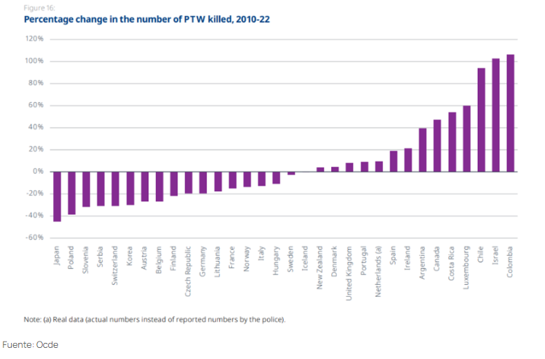 Las muertes de motociclistas en Colombia e Israel aumentaron más de 100%. Varios países muestran que es posible reducir sustancialmente las muertes en ese grupo de usuarios viales: Japón (-44.7 %), Polonia (-38.5%), Eslovenia (-31.8 %), Serbia y Suiza (-30. 8%).