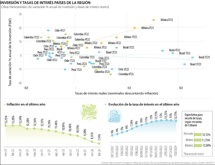 Esto, porque el país inició su ciclo de endurecimiento económico más tarde frente al resto de sus similares de la región y a que el nivel de las tasas se mantuvo alto por más tiempo. Por otro lado, Anif plantea que si bien este fue un factor, el otro aspecto que contribuyó a la caída de la inversión en 2023 fueron los mensajes de incertidumbre de parte del Gobierno.