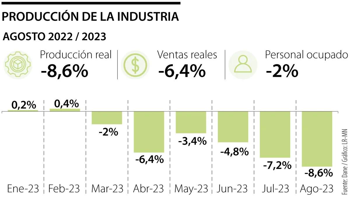 En esa misma línea, la producción de la industria manufacturera cayó 8,6% en agosto y sumó su sexto mes consecutivo en contracción. Del total de 39 actividades, 34 registraron caídas mientras otras cinco tuvieron un leve desempeño positivo. Así, en lo corrido del año, hasta agosto, el indicador registra un retroceso acumulado de 4%.