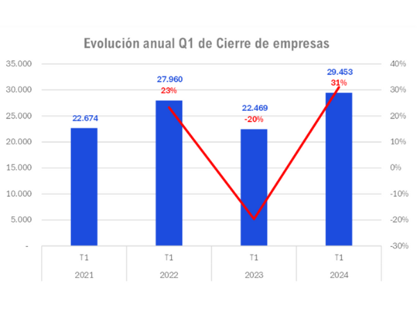 En contraste con la creación de empresas, el cierre de las mismas experimentó un fuerte aumento del 31 % en el primer trimestre de 2024, comparado con el mismo período del año anterior.