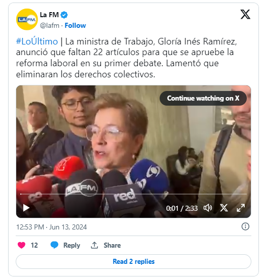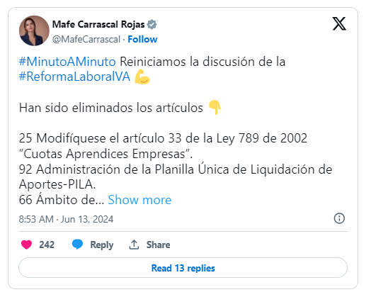 “Estos artículos eliminados fueron concertados, pero tengo que decir en representación de nuestra bancada que lamentamos esta eliminación porque hacia parte fundamental de la reforma. Era todo el capítulo del derecho colectivo. Sin embargo, en aras que la discusión avance y podamos llegar a buenos acuerdos, decidimos concertar”, declaró Carrascal.