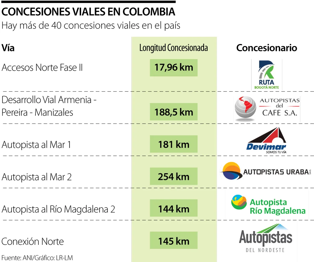 Hoy hay más de 40 concesiones viales, según los datos de la plataforma Aniscopio de la Agencia Nacional de Infraestructura, ANI. Entre ellas están Autopista al Mar 1 y 2; Autopista Conexión Pacífico 1, 2 y 3; ALO Sur, Conexión Norte, entre otras (ver gráfico).