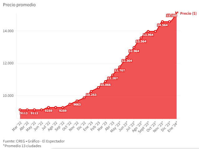 Respecto al ACPM, el precio para los productores se ha mantenido estable en los últimos años, aunque el internacional ha crecido: “eso ha significado un diferencial muy grande, en 2022 fue de $10.451 por cada galón consumido de ACPM”.