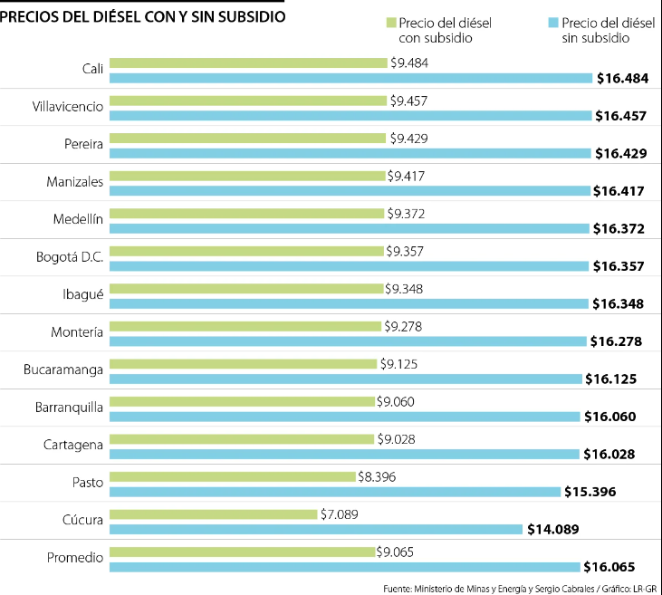 Por otro lado, el ingeniero Sergio Cabrales argumentó que en caso de que se elimine el subsidio del Fondo de Estabilización de Precios de los Combustibles, Fepc, el precio del galón de diésel debería estar casi $5.000 por encima del precio actual. Esto implicaría que el precio en promedio pasaría de $9.065 a $14.065, lo que significaría un aumento de 50%.