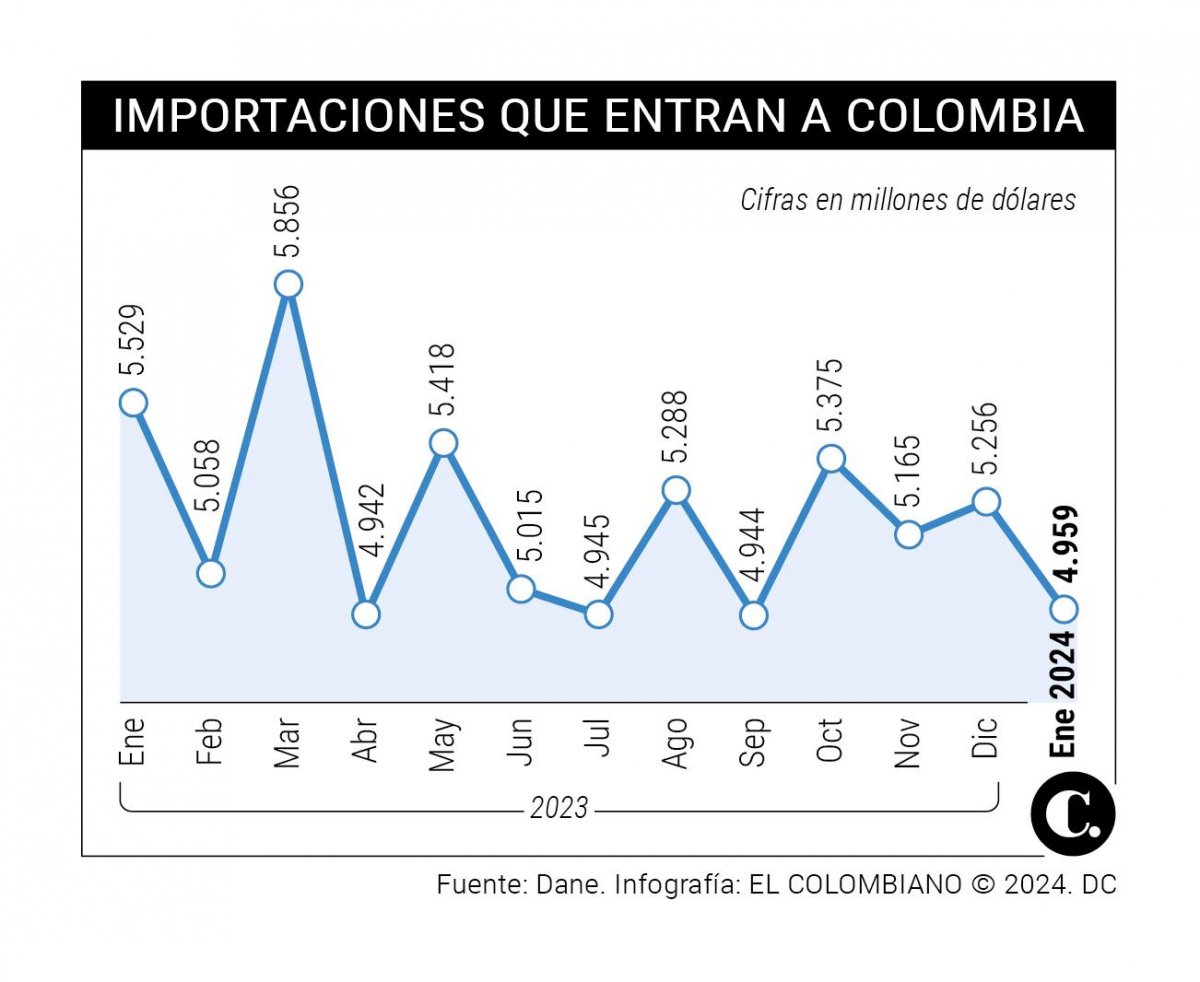 Las importaciones que ingresaron a Colombia cayeron 10,3% en enero de este año frente al mismo mes de 2023.