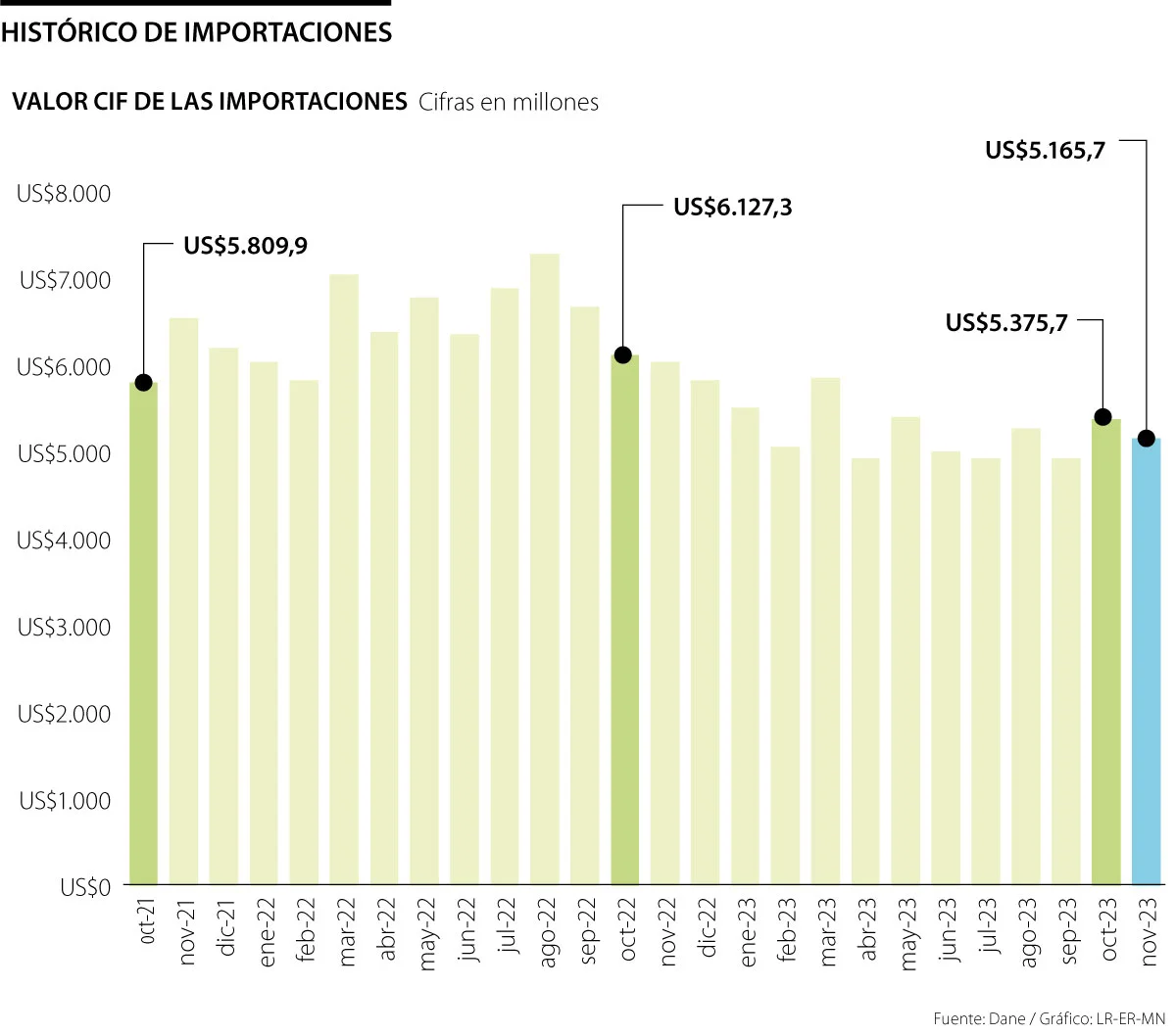 Sobre las manufacturas, el reporte del Dane explica que las importaciones de este tipo llegaron a US$3.705,3 millones CIF: esto representa una caída de 16,1% frente a noviembre de 2022.