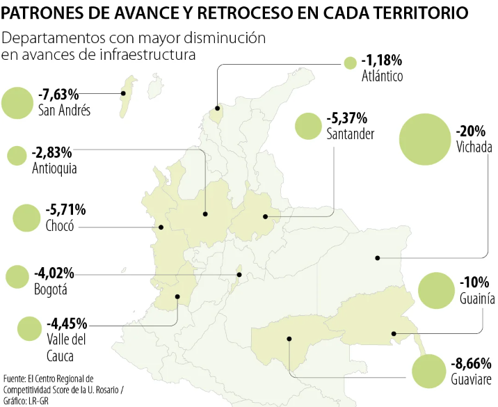 A Vichada le sigue Guainía, con una disminución de 10%, lo que indica desafíos en la calidad y conectividad de su infraestructura. Por su parte, Guaviare es el siguiente al registrar una variación negativa de 8,66%.