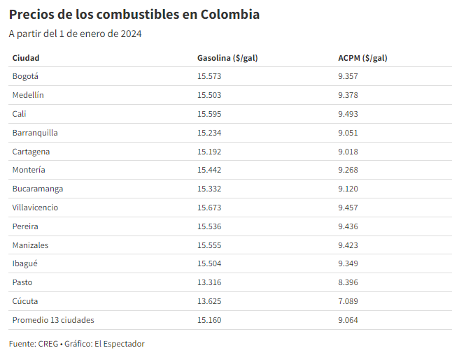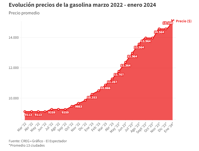 Cabe destacar que, en los últimos 15 meses, el precio promedio del galón de este combustible pasó de $9.259 a $15.160. Según el Gobierno, el objetivo de estos ajustes fue ajustar el déficit que acumuló el Fondo de Estabilización de Precios de los Combustibles (FEPC).
