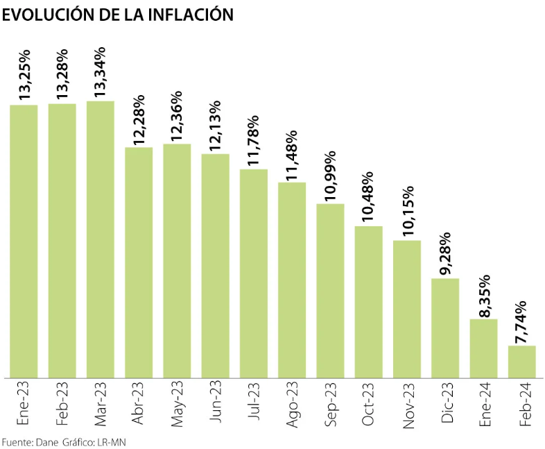 El Departamento Administrativo Nacional de Estadística, Dane, reveló que la inflación en febrero cayó a 7,74% anual, completando así 11 meses de correcciones a la baja desde el pico de 13,34% en marzo del año pasado. Con esto, los analistas señalaron que el Banco de la República tiene mayores argumentos para acelerar la reducción de las tasas.