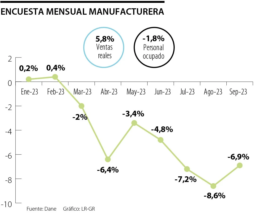 En lo corrido del año hasta septiembre de 2023, la producción real de la industria manufacturera presentó una variación de -4,4%, las ventas reales de -4,2% y el personal ocupado de -0,2%. Y, en los últimos 12 meses se registra decrecimiento de 2,5% en la producción y contracción también en las ventas reales de 2,3%, mientras que el personal ocupado se ha incrementado en 0,5%.
