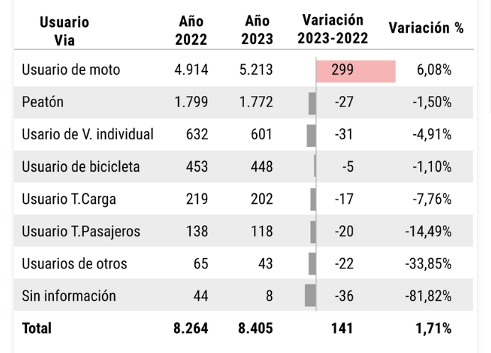 Las cifras de 2023 sorprenden, para mal, por su incremento anual, por un lado. Y, por el otro, porque el único actor de la vía que tuvo un incremento en su mortalidad fueron los usuarios de motos (crecimiento del 6,08 %). Todos los demás, incluyendo ciclistas y peatones, vieron reducciones en sus cifras del año (modestas, pero reducciones al final).