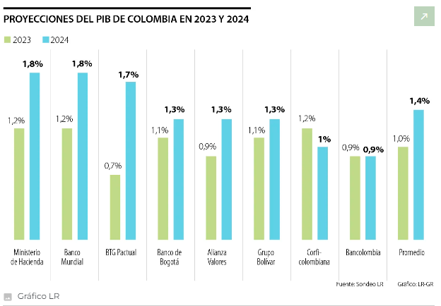 La reducción en los tipos, actualmente en 13%, es un factor determinante para algunos analistas. “Esperamos una ligera aceleración este 2024 del PIB, por dos temas puntuales. El primero, la caída de la inflación, lo que permite que los consumidores reactiven sus patrones de consume y, por otro lado, la caída en la tasa de interés”, puntualizó David Cubides, director de estudios económicos de Alianza Valores, que prevé 1,3% este año.