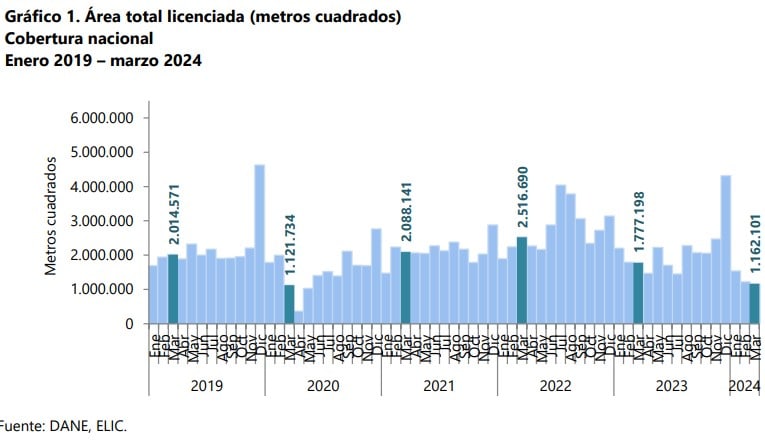 En el periodo enero – marzo de 2024 se licenciaron 3.920.510 m² para edificación, mientras que en el mismo periodo de 2023 fueron 5.751.368 m², lo que representó una disminución de 31,8 %. El área aprobada disminuyó 30,9 % para vivienda, y 34,8 % para los destinos no habitacionales.
