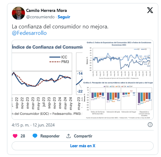 Estas dinámicas van en línea con el reciente reporte de Fedesarrollo de confianza del consumidor, su indicador cerró en -14,1% para mayo de 2024, una disminución de 2,7 puntos porcentuales, en comparación con el balance de abril.