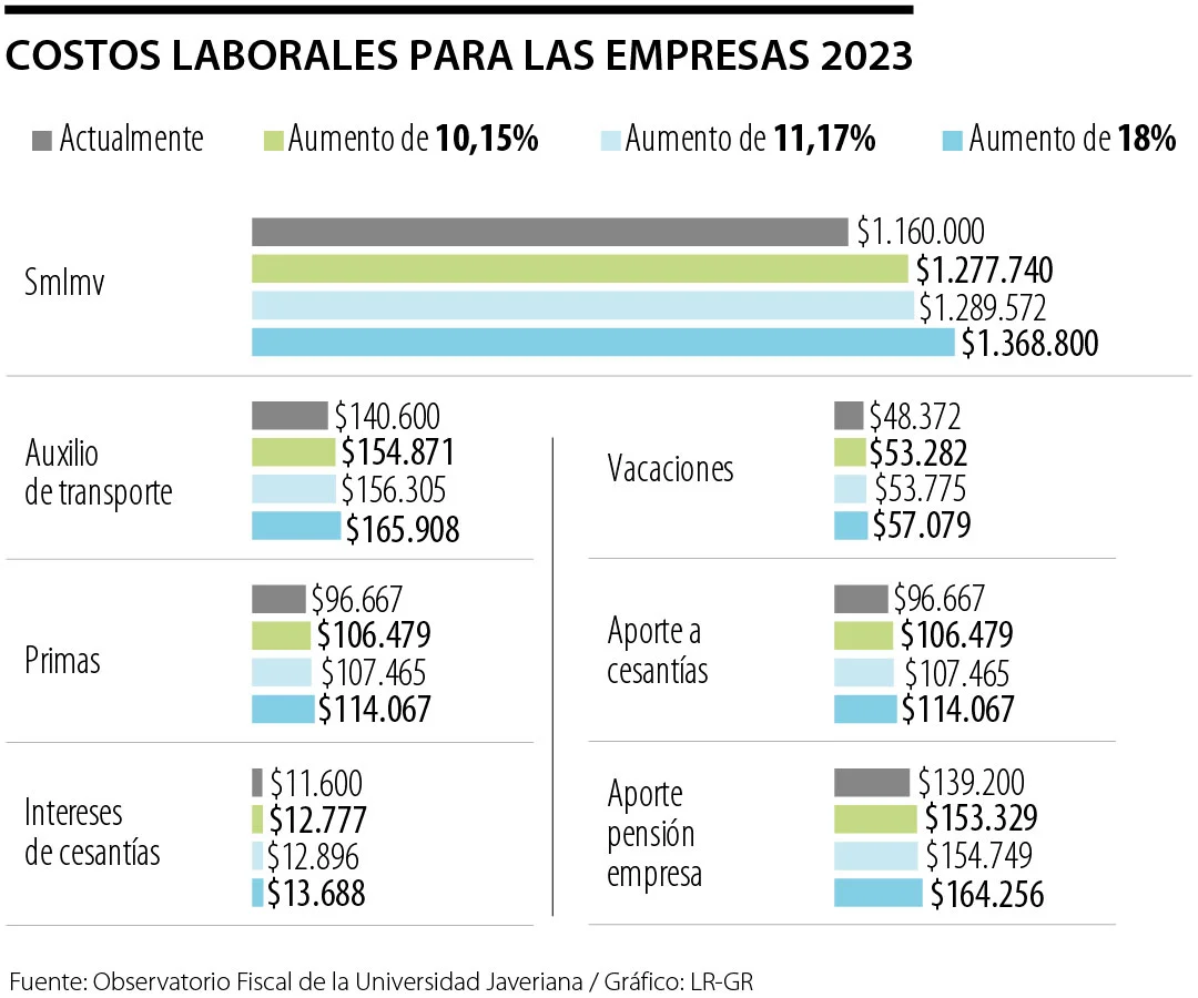 Actualmente, de acuerdo con un cálculo del Observatorio Fiscal de la Universidad Javeriana, un trabajador que devenga un salario mínimo le cuesta $1,8 millones a una empresa. De esta forma, con el alza estimada por los empresarios estos costos laborales ascenderían hasta $1,9 millones.