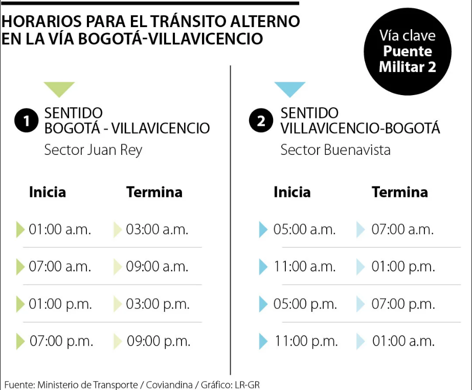 El plan de movilidad alterna implica el tránsito por el puente militar 2, que normalmente opera en sentido Villavicencio-Bogotá. Este plan se hace de forma escalonada en el sector Juan Rey para el sentido Bogotá-Villavicencio y en el punto Buenavista para Villavicencio-Bogotá.