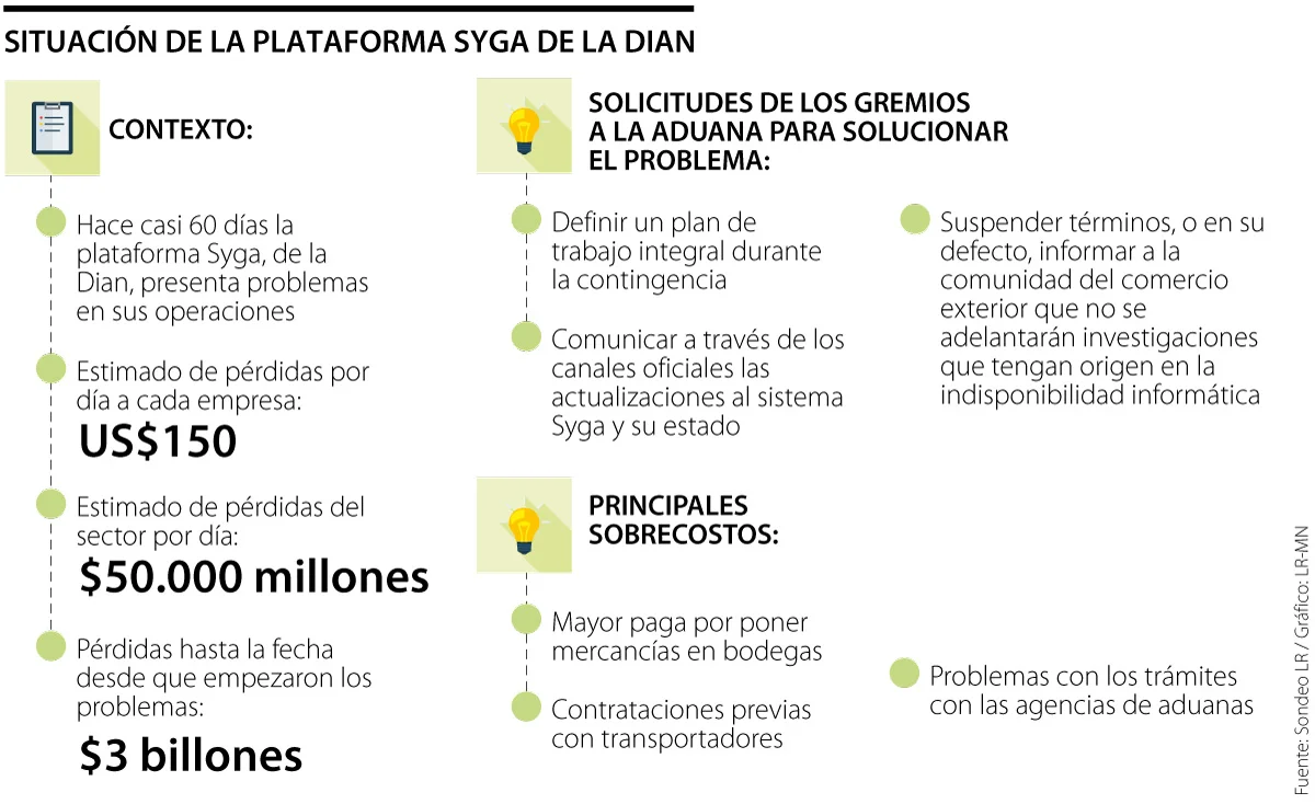 El comercio exterior en Colombia ha presentado dificultades casi por 60 días, desde que el Syga, Sistema de Información y Gestión Aduanera, de la Dian para importaciones, empezó a presentar fallas en sus operaciones desde el 20 de noviembre del año pasado.