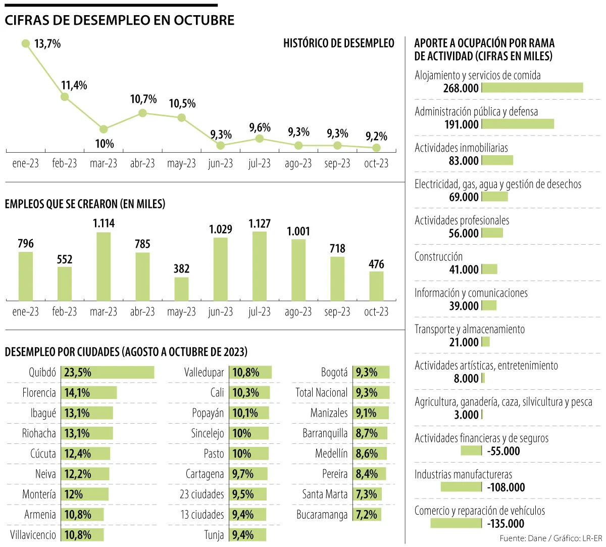 En Bogotá, por otro lado, la tasa de desempleo fue de 9,3% en octubre, con una caída de 0,2 puntos porcentuales frente al mismo mes del año pasado.