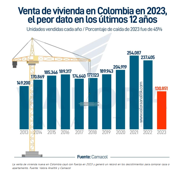 La venta de vivienda nueva en Colombia cerró el 2023 con una fuerte caída de casi 50 %, lo cual -de paso- generó un desplome de la inversión en el sector constructor.